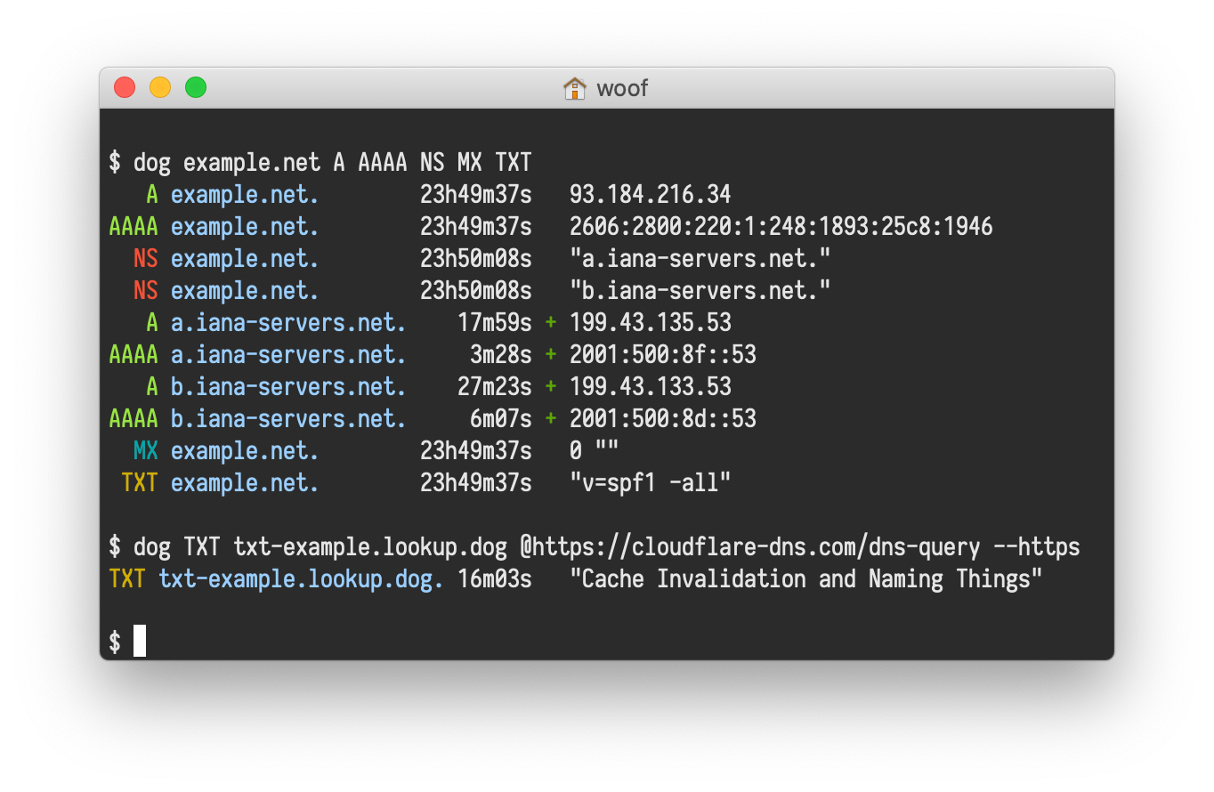 dog is a command-line DNS client, like dig. It has colourful output, understands normal command-line argument syntax, supports the DNS-over-TLS and DNS-over-HTTPS protocols, and can emit JSON.
